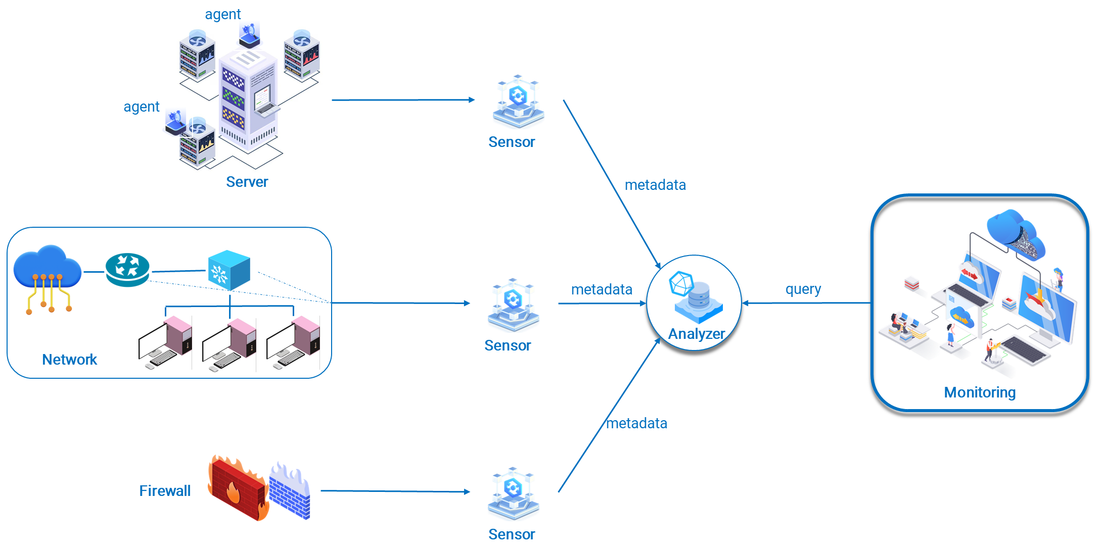 - Bước 1: Khảo sát hạ tầng CNTT của tổ chức/doanh nghiệp để cài đặt máy chủ collector, sensor, sao chép lưu lượng mạng.