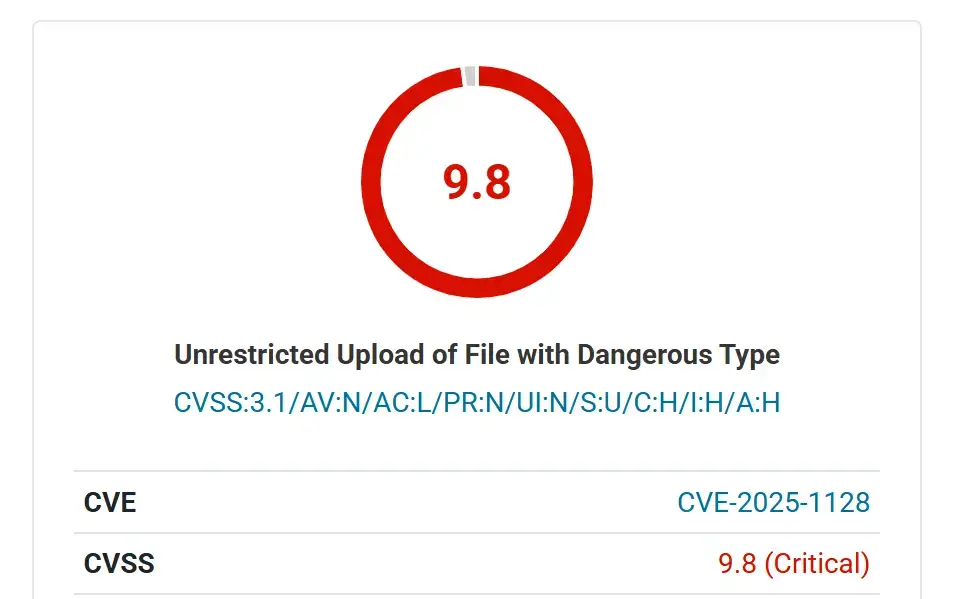 CVE-2025-1128 (CVSS 9.8): Lỗ hổng cho phép những kẻ tấn công không được xác thực tải lên các tệp tùy ý, thực thi mã từ xa và thậm chí xóa các tệp cấu hình quan trọng, có khả năng dẫn đến việc chiếm toàn bộ trang web.
